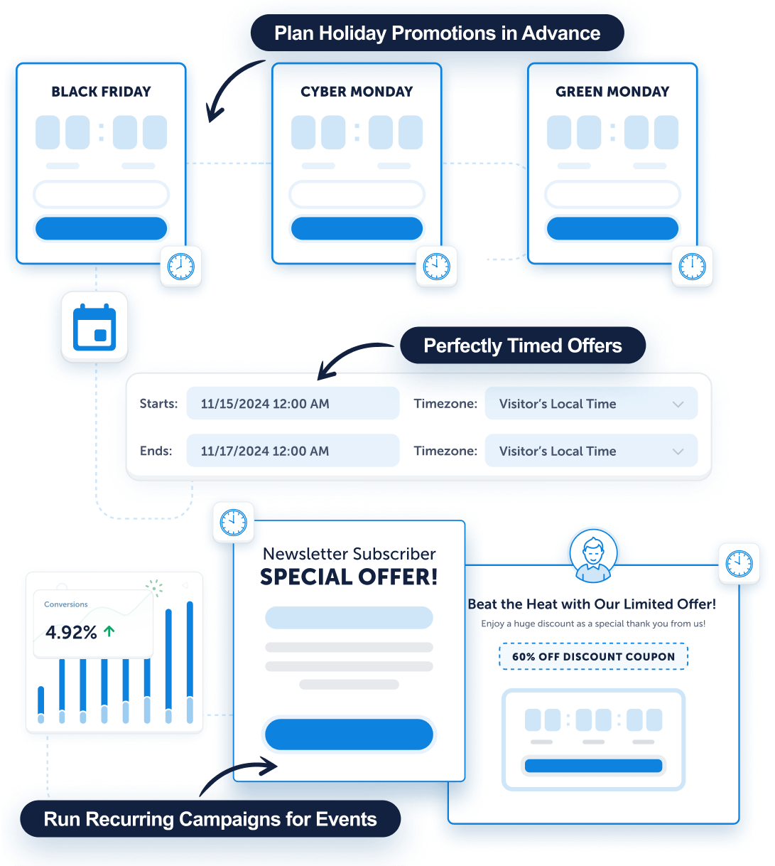 - Run recurring campaigns for events like Black Friday, Cyber Monday, or summer sales.