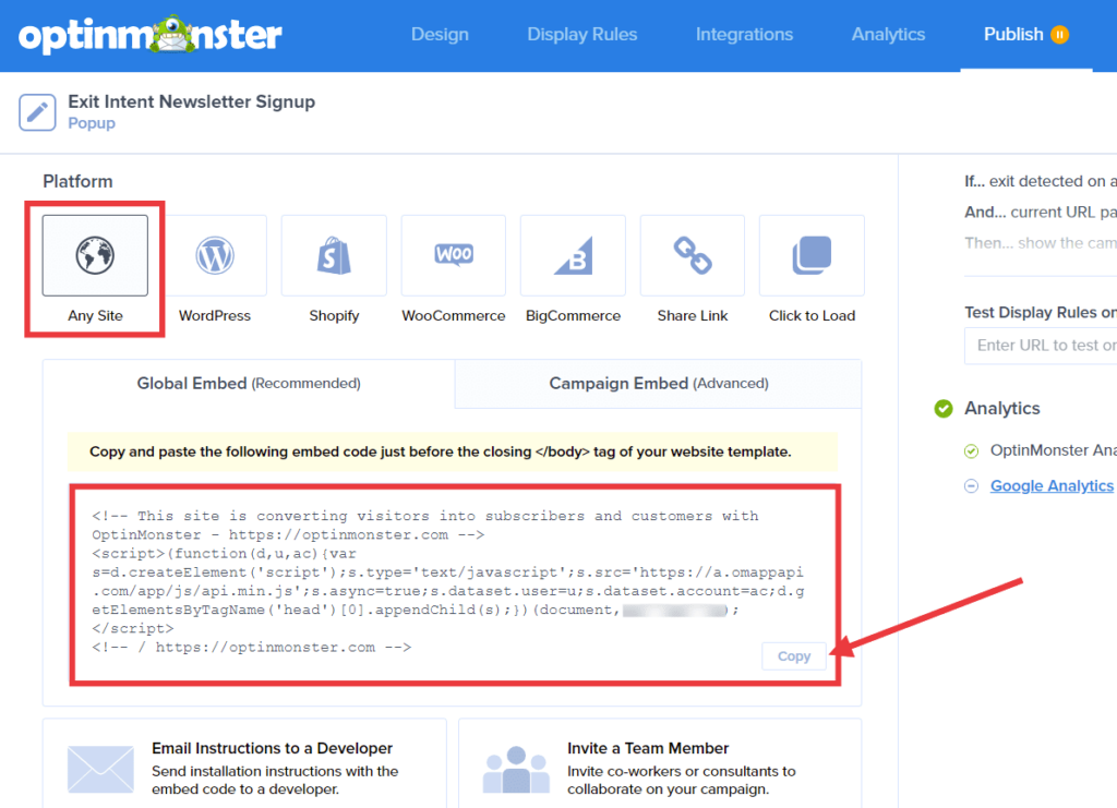 If you have already created a campaign in OptinMonster, you can also find your account-wide (aka Global) embed code on the Publish view of the campaign builder, under Platform > Any Site.
